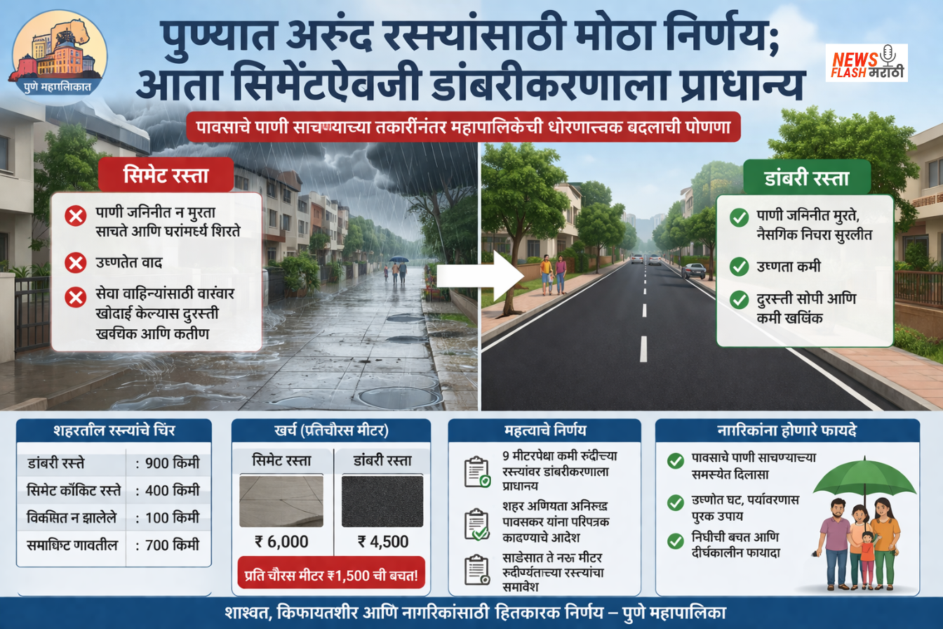 महापालिकेच्या Pune Municipal Corporation आकडेवारीनुसार, सिमेंट रस्त्यासाठी प्रति चौरस मीटर सुमारे ६,००० रुपये खर्च येतो, तर डांबरी रस्त्यासाठी हा खर्च ४,५०० रुपयांपर्यंत मर्यादित आहे. त्यामुळे डांबरीकरण केल्यास मोठ्या प्रमाणावर निधीची बचत होणार आहे.